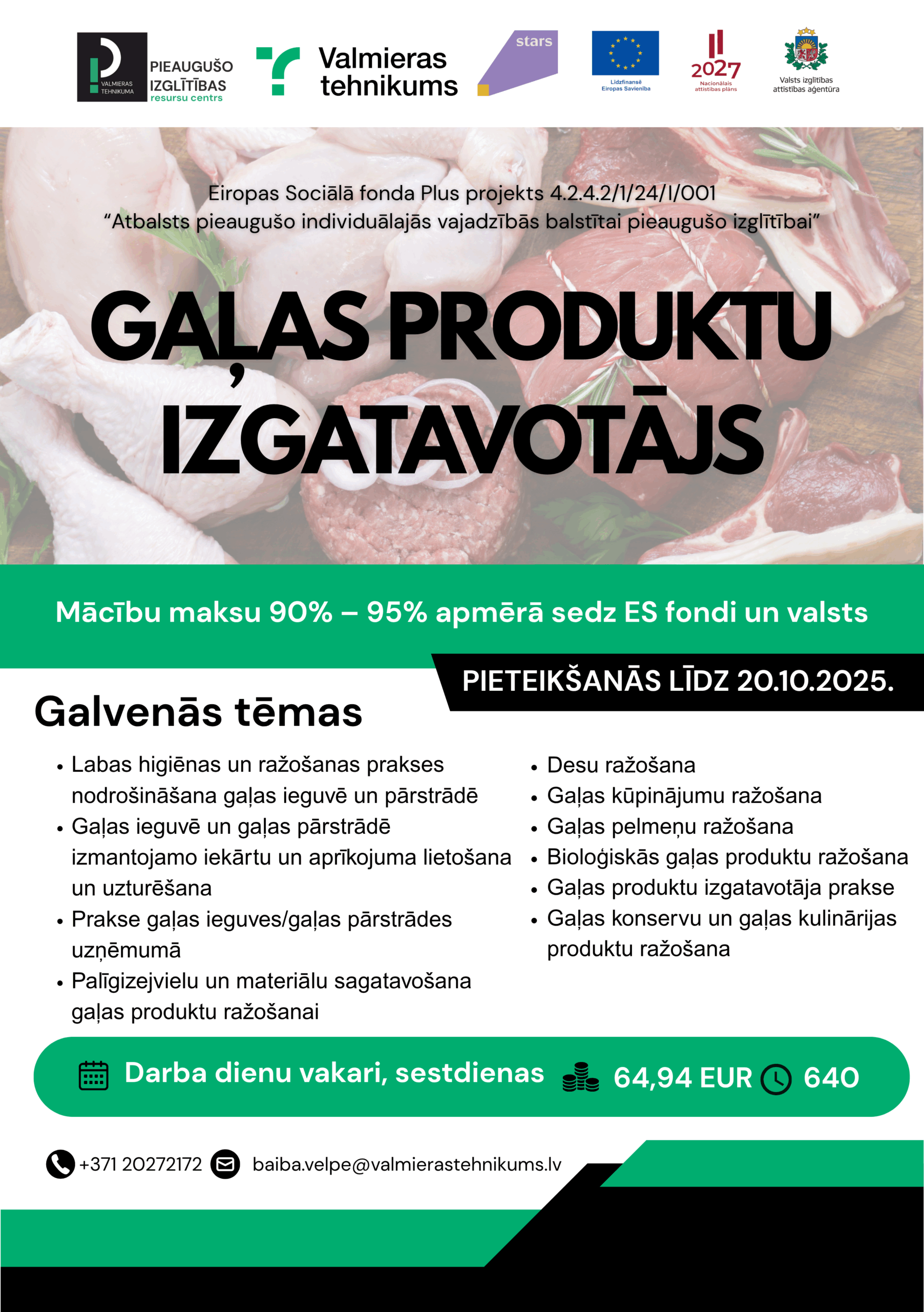 Mācies ar ES fondu atbalstu un kļūsti par gaļas produktu izgatavotāju! Mācību maksu 90–95% apmērā sedz ES fondi un valsts, tādēļ tavs līdzmaksājums ir tikai 5–10%.