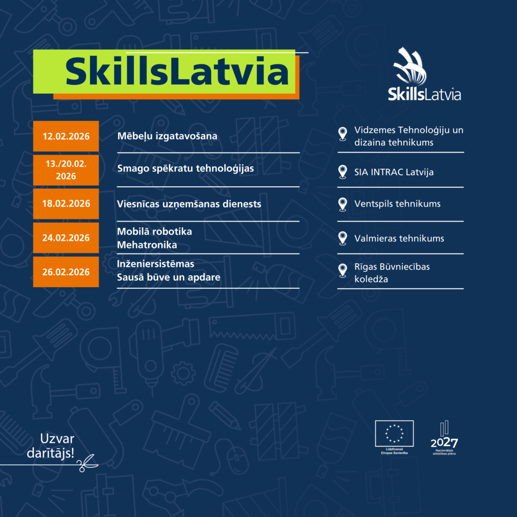 Laika posmā no 13.janvāra līdz 26.februārim norisināsies nacionālā jauno profesionāļu meistarības konkursa SkillsLatvia 2026 pusfināli. Vairāk nekā 250 jaunie speciālisti apliecinās savu zināšanu un prasmju izcilību 20 dažādos prasmju konkursos, lai cīnītos par iespēju nokļūt SkillsLatvia 2026 finālā. Pusfināli notiks 13 profesionālās izglītības iestādēs visā Latvijā, tostarp Valmieras tehnikumā, un divos nozares uzņēmumos.