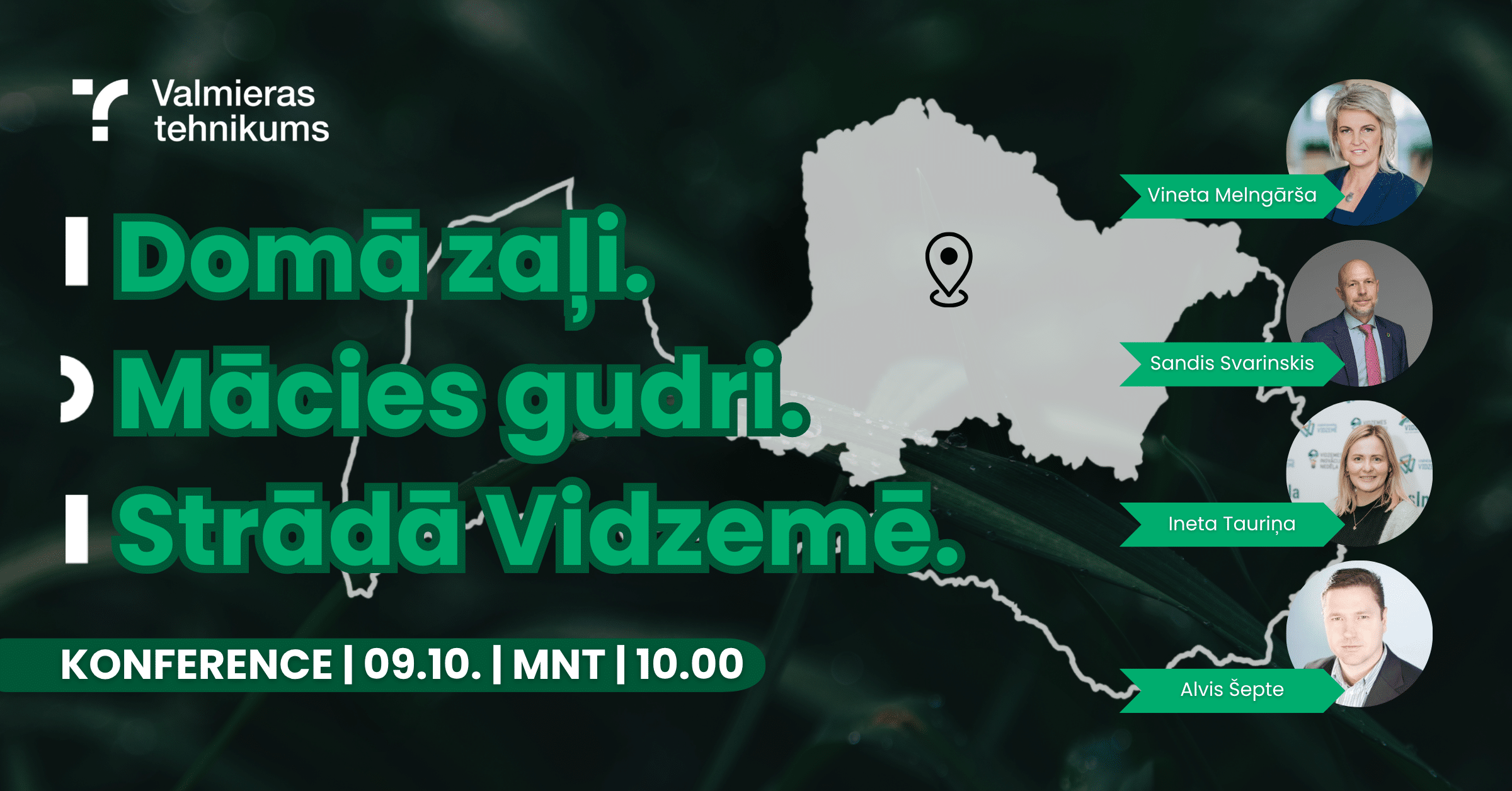 Karjeras nedēļas ietvaros 9. oktobrī plkst. 10.00 aicinām interesentus apmeklēt konferenci “Domā zaļi. Mācies gudri. Strādā Vidzemē.” Konference notiks Valmieras tehnikumā, Vadu ielā 3, Valmierā, MNT.