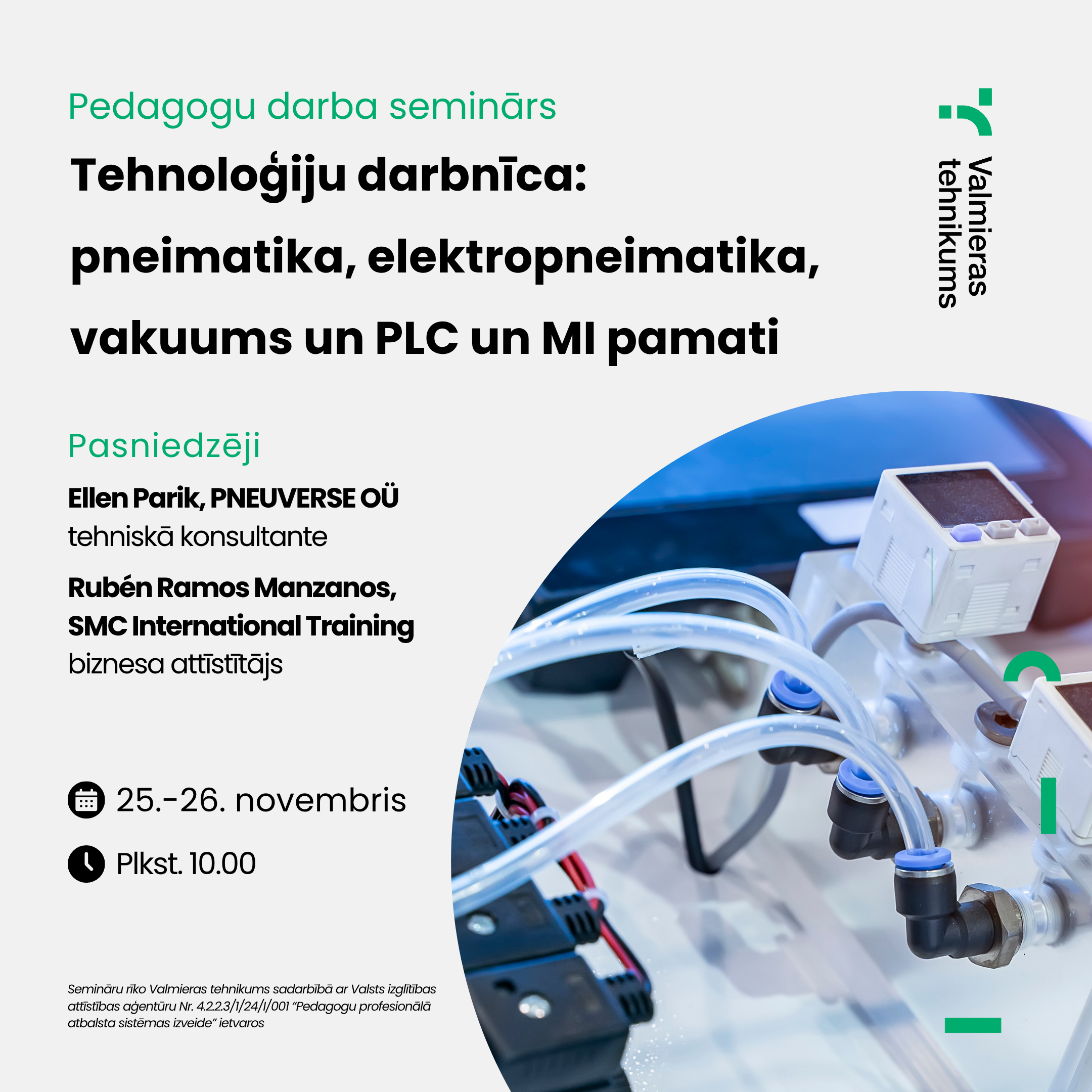 Valmieras tehnikums sadarbībā ar Valsts izglītības attīstības aģentūru projekta Nr. 4.2.2.3/1/24/I/001 “Pedagogu profesionālā atbalsta sistēmas izveide” ietvaros 2025. gada 25.-26. novembrī organizē pedagogu profesionālās kompetences pilnveides praktiskā darba semināru “Tehnoloģiju darbnīca: pneimatika, elektropneimatika, vakuums un PLC un MI pamati” (turpmāk – Seminārs) 18 akadēmisko stundu apjomā, kas paredzēts profesionālās izglītības iestāžu, kurās apgūst profesionālās izglītības programmu “Mehatronika”, pedagogiem, kas pasniedz moduļus “Hidraulisku un pneimatisku mezglu apkope un remonts”, “Programmējamo loģisko kontrolleru programmēšanas pamati” un “Inovatīvo tehnoloģiju lietojums ražošanā”.