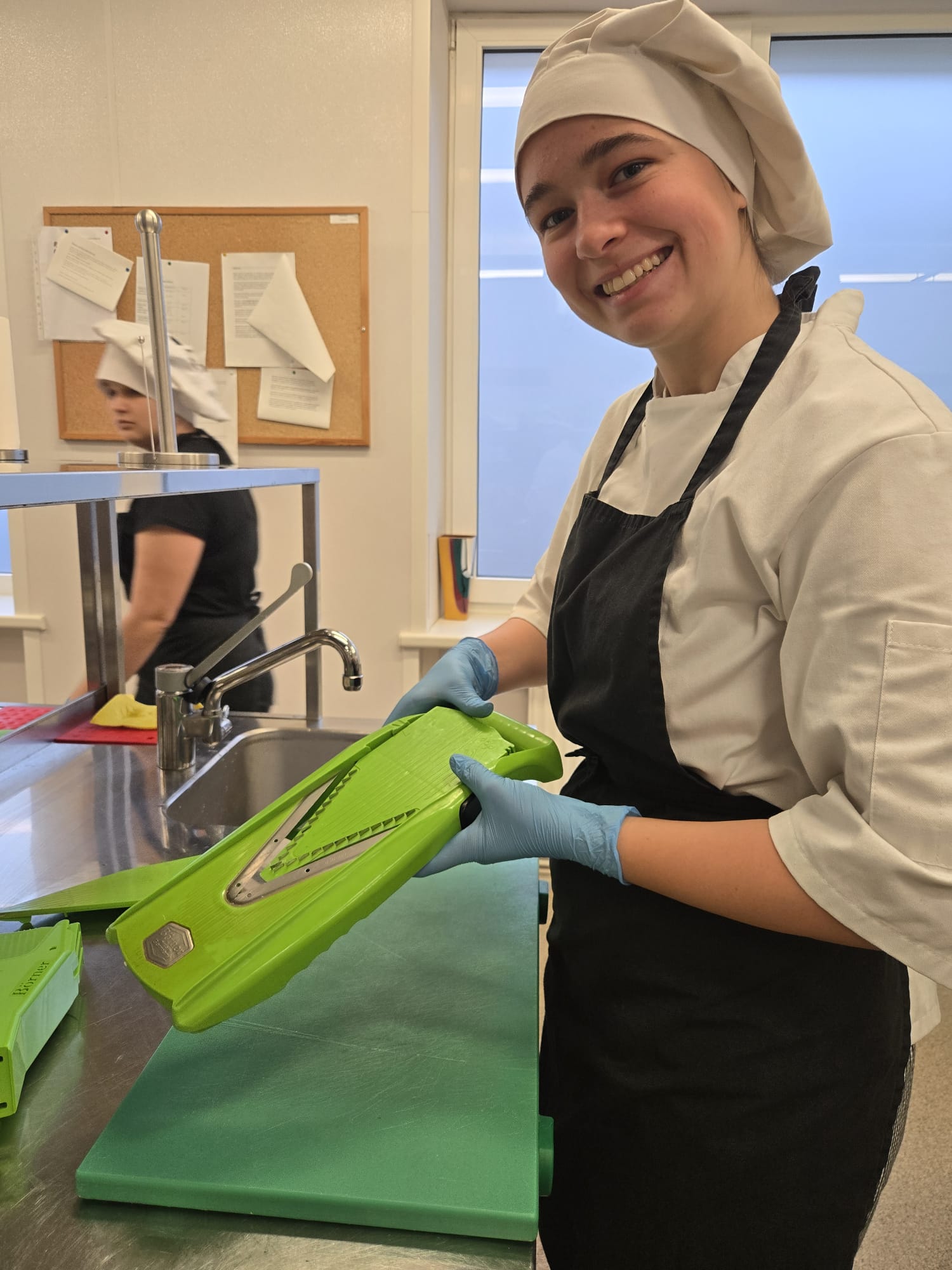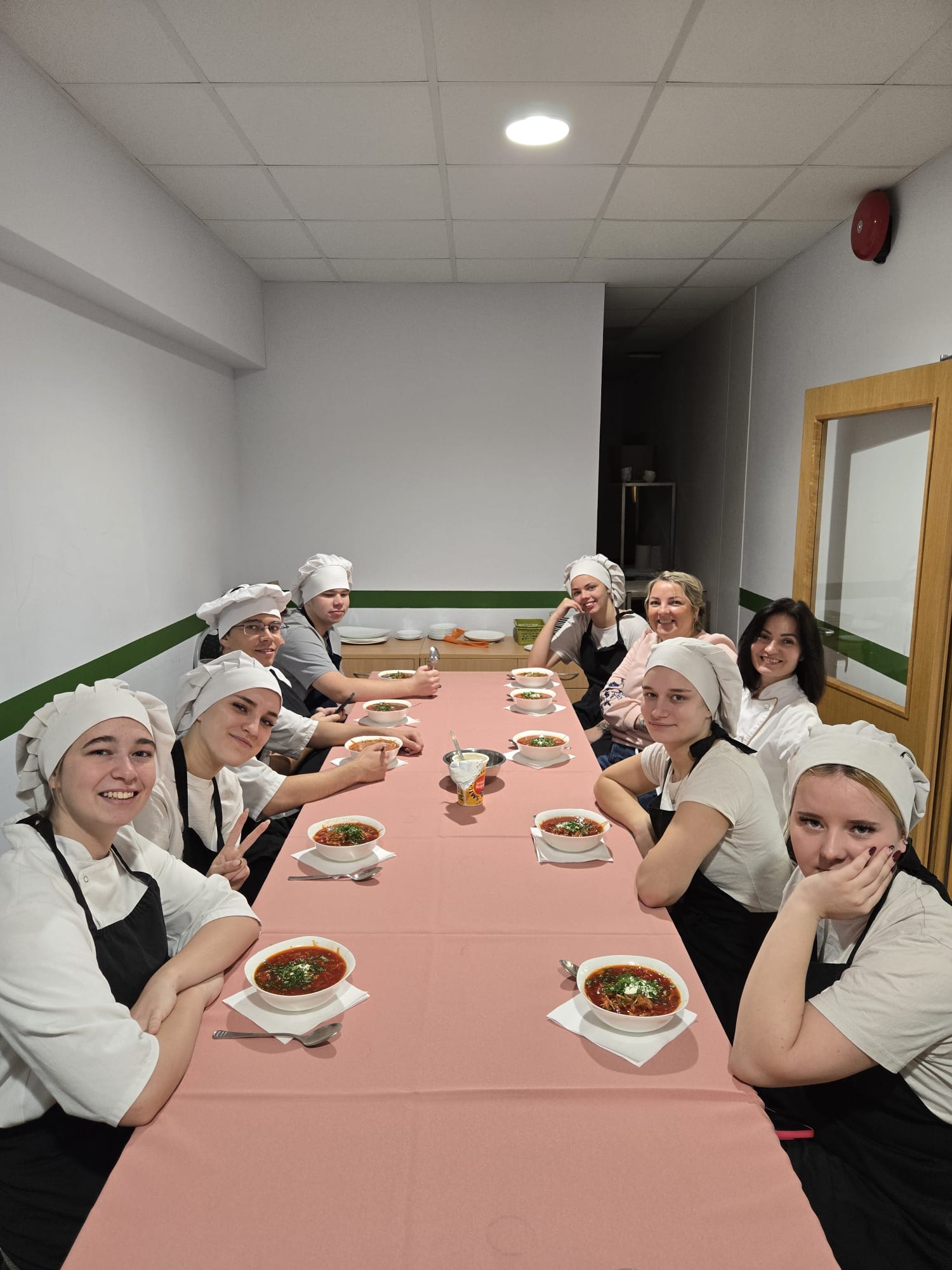 Skolotājas Sanita Reinfelde un Olha Soročinska (Sorochynska) vadīja kombinēto mācību stundu, kurā kopā ar 4. kursa (5. grupas) topošajiem pavāriem gatavoja ukraiņu boršču. Gatavošanas procesā skolotājas skaidroja darbības, izmantojot profesionālo saziņu svešvalodās.