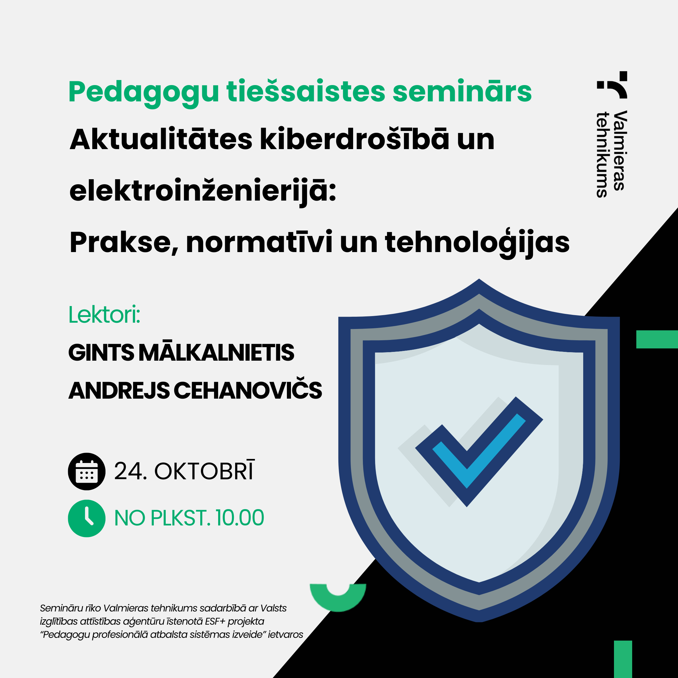 Valmieras tehnikums sadarbībā ar Valsts izglītības attīstības aģentūru projekta Nr. 4.2.2.3/1/24/I/001 “Pedagogu profesionālā atbalsta sistēmas izveide” ietvaros 2025. gada 24. oktobrī organizē pedagogu profesionālās kompetences pilnveides tiešsaistes semināru par aktualitātēm “Aktualitātes kiberdrošībā un elektroinženierijā: Prakse, normatīvi un tehnoloģijas” (turpmāk- Seminārs) 6 akadēmisko stundu apjomā, kas paredzēts profesionālās izglītības iestāžu pedagogiem mehatronikas un enerģētikas mācību jomā.