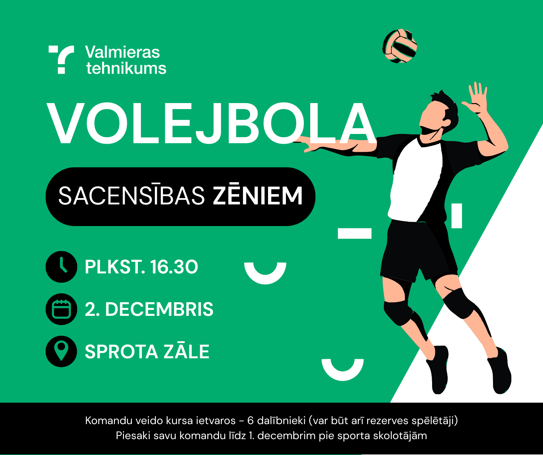 2. decembrī plkst. 16.30 Valmieras tehnikuma sporta zālē notiks volejbola sacensības zēniem!