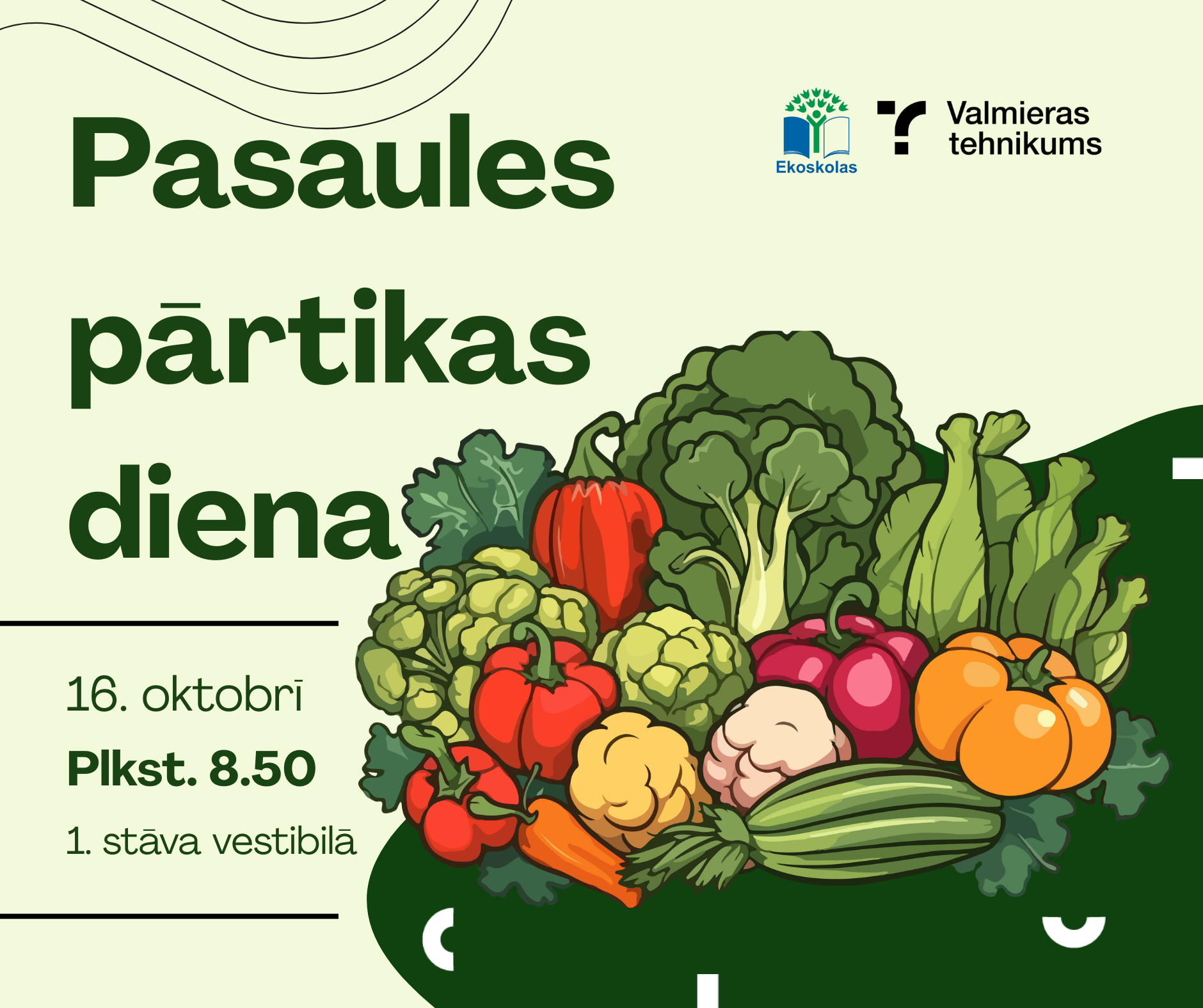 16. oktobrī no plkst. 8.50 Valmieras tehnikuma Ekopadome aicina pievienoties un atzīmēt Pasaules pārtikas dienu 1. stāva foajē.